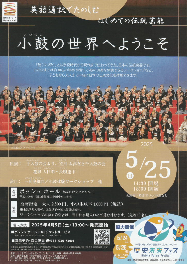 直近では5月25日に横浜市都筑区民文化センター「ボッシュホールで」「千人鼓の会」の公演が開催されます。