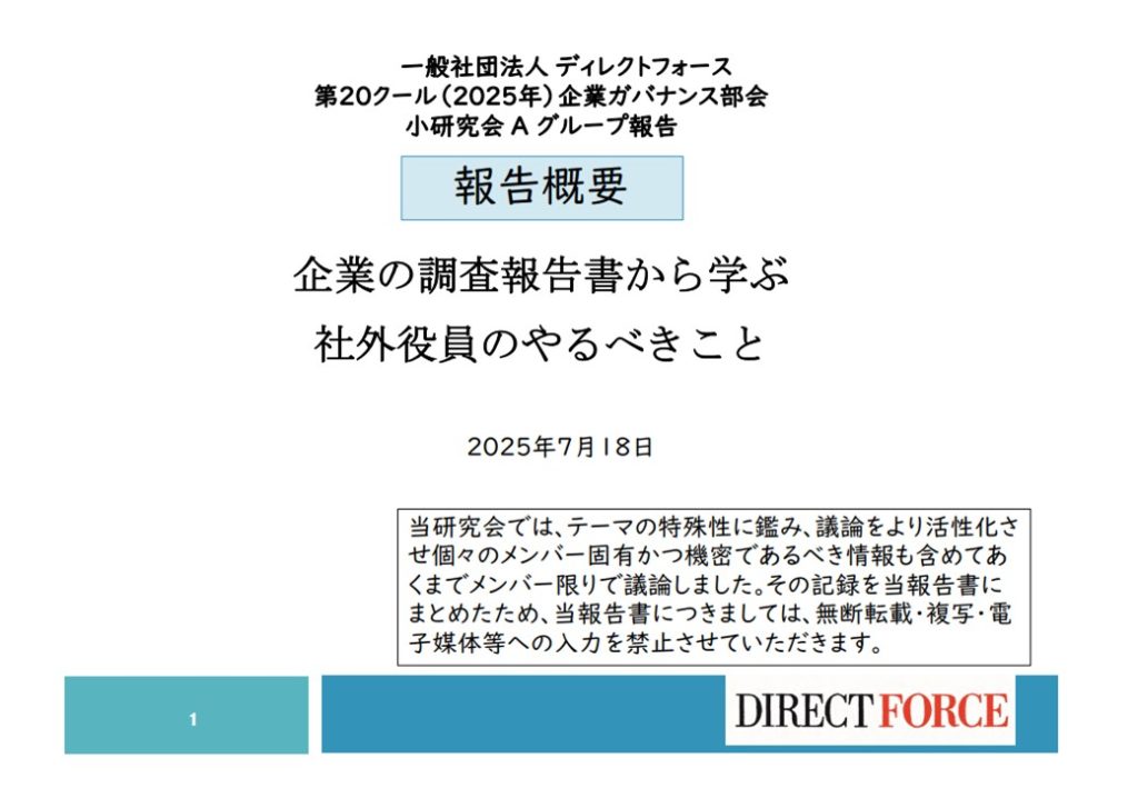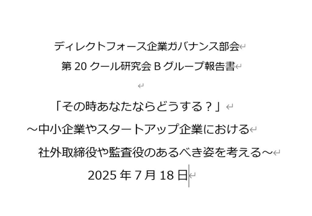 2025年9月6日 第20クール企業ガバナンス部会(2025年)A、Bグループ研究成果報告書 Tweet Aグループ報告書 企業の調査報告書から学ぶ社外役員のやるべきこと 会員限定のPDFはこちら Bグループ報告書 「その時あなたならどうする?」~中小企業やスタートアップ企業における社外取締役や監査役のあるべき姿を考える~ 以 上(國安幹明)