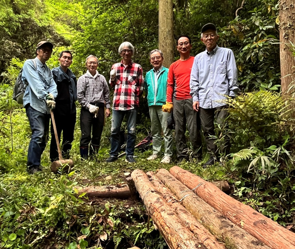 当初は日土地社のご好意で、現地事務所内で昼食に「豚汁」を振舞って頂いてから現場に出掛けていました。今はコロナもあってこれは無くなりましたが、整備活動に必要な手ノコや手斧などの「得物」は同社のご好意で貸与して下さっていますので、大変助かっています