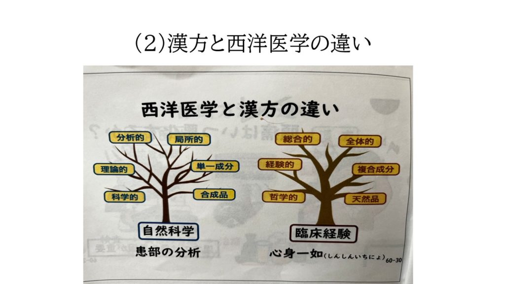 - 西洋医学は「患部の分析」を行うのに対し、漢方は「心身一如」で、精神面も含め総合的に疾患の状態を分析する。