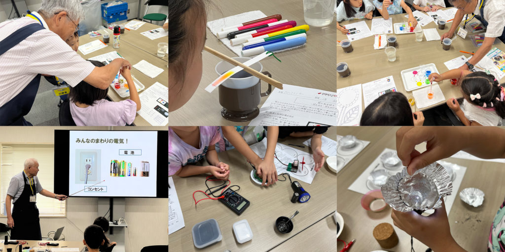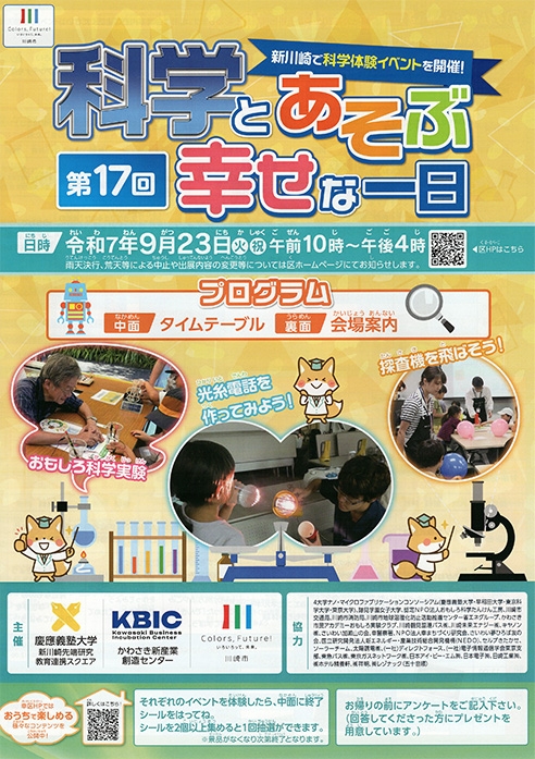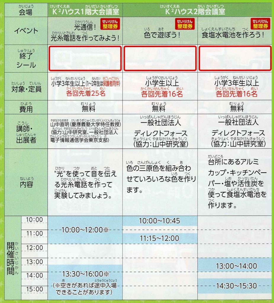 9⽉23 ⽇(⽕、祝)に新川崎慶應キャンパスで「慶應K2科学とあそぶ幸せな⼀⽇」が開催されました。ディレクトフォースからは山中直明氏(慶應義塾大学特任教授)の協力のもと、午前はテーマ「⾊とあそぼう」(加藤信子TL)で2コマ、午後はテーマ「食塩電池を作ろう」(森山健一TL)で2コマ⾏われました。各回定員16名のところ毎回⼤盛況で、予定64名を⼤きく上回る75名が参加しました。保護者の⾒守る中、⼦供たちは楽しそうに実験に取り組んでいました。保護者や主催者からの評判も良く成功裏に終わった⼀⽇となりました。