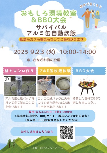 POブルーアースは、今年横浜市夢ファンドNPO基盤強化助成金をいただいたので、外部連携強化のためにその一部を活用させてもらって、先日9月23日にかなざわ海の公園で、「おもしろ環境教室 “アルミ缶自動炊飯” とBBQ大会」のイベントを開催しました。(ちらし写真参照)