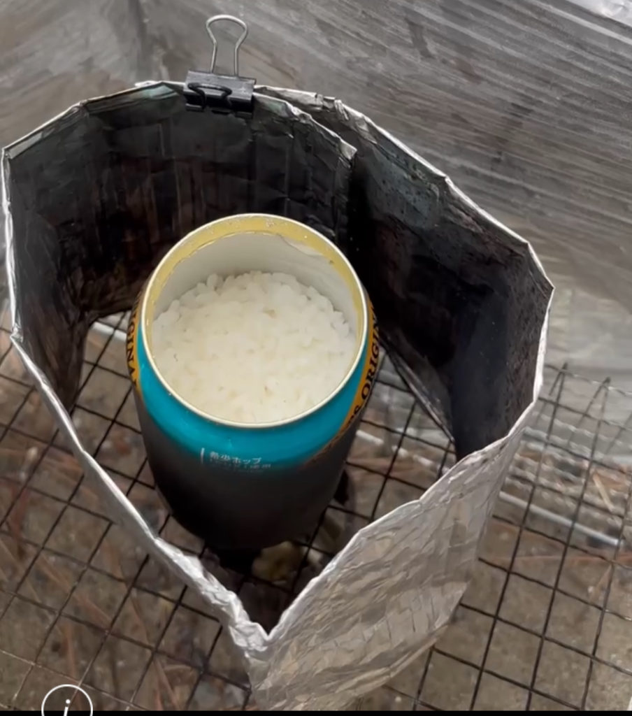 持参のアルミ缶2個と牛乳の紙パック1個を工作して、お釜・コンロ・燃料を制作し、0.8合のご飯を炊きました。電気もガスもキャンプ設備がなくても簡単にこんな美味しいご飯が炊けることに参加したご家族も感激してくれました。
