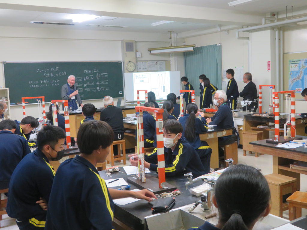 これに対し、水力発電は無害で効果的なのだが、日本には、ダムを建設する適地がなくなりつつある。これを埋める手法として小規模の発電(例えば小川を使う)や、余剰の夜間電力を使う揚水式発電がある。」との回答がありました。 - 10月31日(金) 十日町中学校 テーマ 「クレーンの秘密 滑車のしくみ」