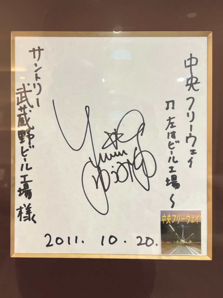この工場は、荒井由実の歌「中央フリーウェイ」の歌詞で、「右に見える競馬場、左はビール工場」と歌われている工場で、工場受付には荒井由実の色紙も展示されていました。