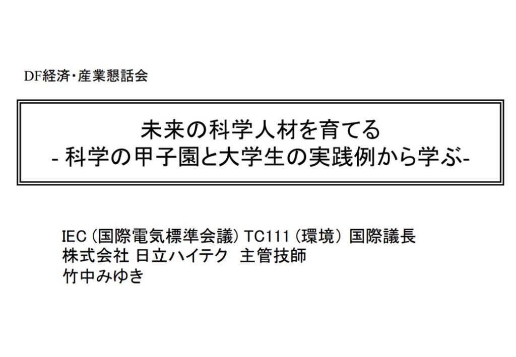 今回は東芝の研究所を出発に、多くの国際的組織への日本代表などで活躍され、科学技術振興機構 「科学の甲子園」運営委員を担当された、竹中みゆきさんから「未来の科学人材を育てる」という課題でお話があり、次世代の若者が理科離れの傾向にあることについて熱心な討議がありました。
