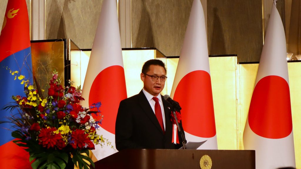 1924年11月26日に、モンゴルが初めての近代憲法を制定して共和制を宣言したことを祝賀して開催されたもので、モンゴル側から、バヤルサイハン駐日モンゴル大使、ガンホヤグ副首相、日本側から、鈴木農林水産大臣、島田外務大臣政務官、長島衆議院日本・モンゴル友好議員連盟会長が挨拶を行うなど、多くの関係者が出席しました。