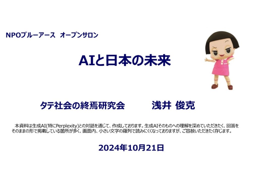 浅井さんはNPOブルーアースのオープンサロンで、「生成AIとの対話;AI時代を日本人はどう生きるべきか?」、「AIと日本の未来」のタイトルで話をされています。関心のある方はそちらを是非、ご覧ください。