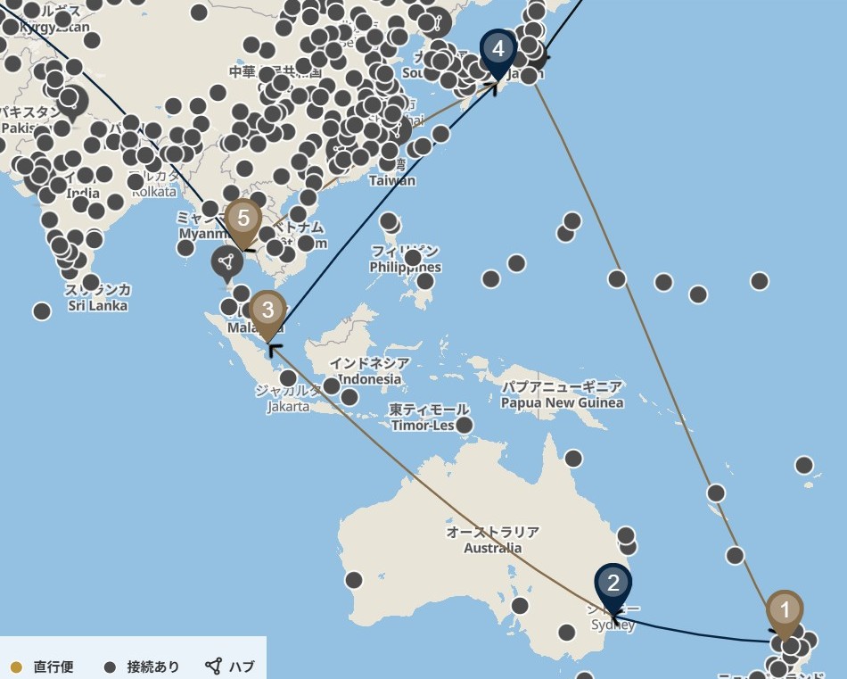 ようやく固まった旅程は2024年3月6日成田発‐オークランドシドニー‐シンガポール(part-1)、一旦帰国した後、バンコク‐ロンドン‐ブリュッセル‐デュッセルドルフ‐パリ‐シュツットガルト‐チューリッヒ‐トロント‐シカゴ‐5月24日成田着(part-2)。以上48日間の旅。
