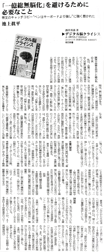 脳科学を専門とする酒井邦嘉氏の著書『デジタル脳クライシス~AI時代をどう生きるか』を、DF授業支援の会で活躍している池上眞平会員(859)が評しています。