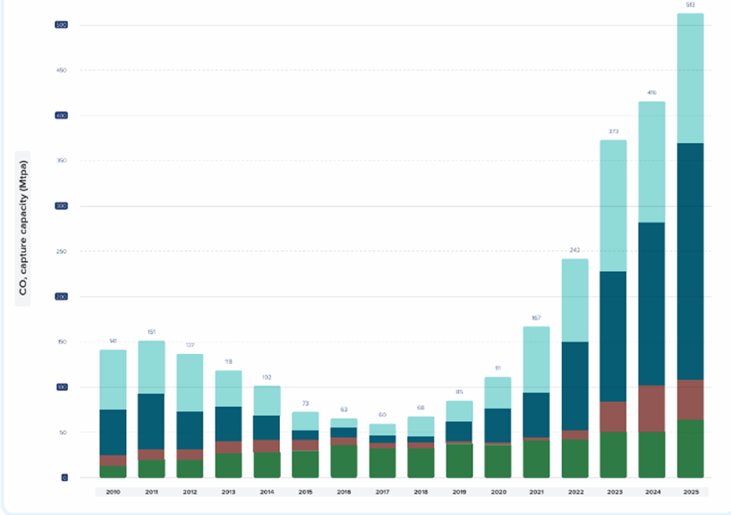 “Global Status of CCS 2025” (Global CCS Institute)によると、現在、世界で稼働中の商業規模のCCSは77あり、合計貯留量は64百万トン/年である。建設中のCCSは47(合計貯油量は44百万トン/年)あり、近いうちに世界のCCS合計貯留量は100百万トン/年に達する見込みである。2013年の世界のCCS合計貯留量は約25百万トン/年で、その後の成長は緩慢であったが、2023年以降、増加傾向に転じている。CCSが脱炭素社会実現の一手法として、政策支援が強化されてきたためである。しかし、CCSはコスト高である。事業者は掘削・貯留・モニタリング等に係る研究開発を進め、CCS開発コストの低減に向けて不断の努力が必要である。