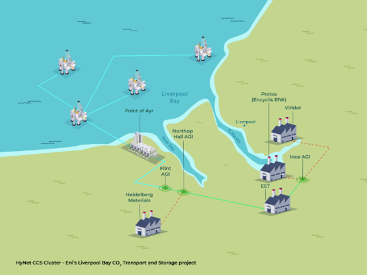 英国リバプール近郊のセメント工場、ごみ焼却発電所、ブルー水素製造プラント等で発生するCO2を回収し、沖合29㎞に位置する枯渇ガス田に貯留するリバプール湾CCS事業が動き始めた。2028年に稼働開始予定で、貯留量は450万トン/年。2030年代に1千万トン/年へ増強する。CO2の輸送・貯留はイタリアの石油会社Eniが担い、枯渇ガス田の既存設備を活用して、開発コストの低減を図る。2018年、英国北西部の工業地帯の企業が中心となり、地元で水素を製造し、地元でCCSを行って脱炭素を進めるプロジェクト「Hynet North West」が始まった。リバプール湾CCSはこのプロジェクトの一環である。英国は2030年代に世界有数のCCS産業を構築するという国家戦略を立て、220億ポンド(約4兆円)の長期支援枠を確保している。