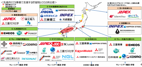 2024年、CCS事業法が制定され、首都圏CCS、苫小牧CCSを含む国内5か所のCCS事業と、国外4か所のCCS事業が先進的CCSプロジェクトとして選定された。国外事業は国内で回収したCO2を船で運び、マレーシア、オーストラリア沖等の枯渇油ガス田に貯留する。これら9プロジェクトには、石油精製、鉄鋼、電力、化学、紙、パルプ、セメント等の企業が参加しており、国は2030年までにCO2の年間貯留量6百~12百万トンを確保したいとしている。