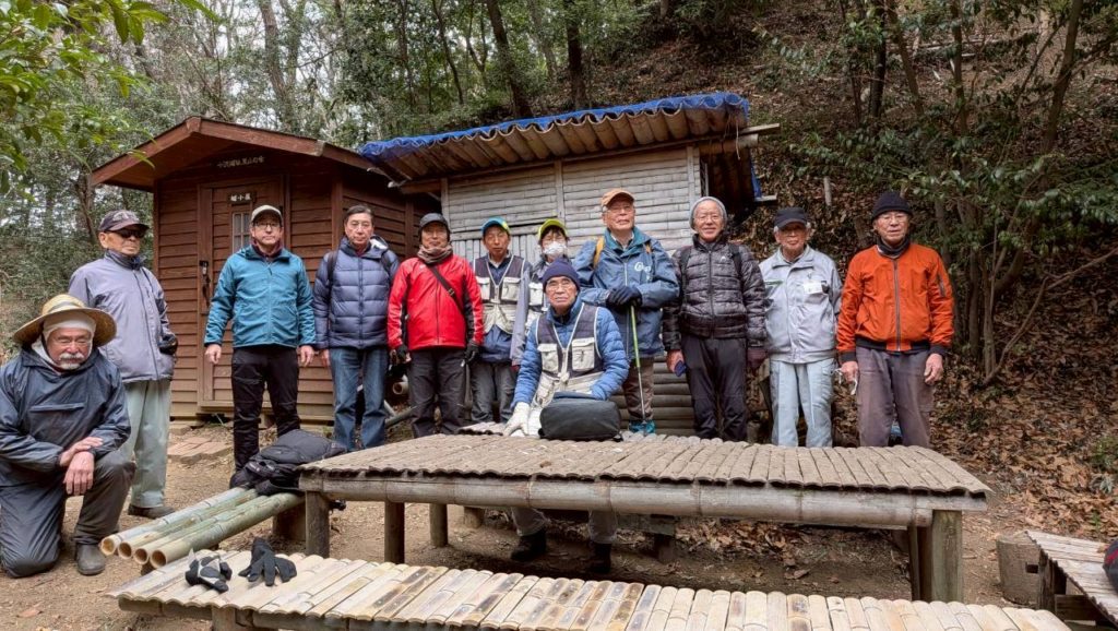 当日は第2土曜日の活動日で、10人ほどの会員が倒木の処理や竹の伐採、遊歩道の笹除去などの作業をやっておられたが、中腹に立派な作業小屋が2棟も建てられており、鎌、手ノコ、草刈り機などの道具や材料が綺麗に整理されて備えられていました。