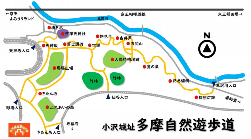 小沢城址は川崎市多摩区の丘陵上にあります。山中には空堀や物見やぐらと思われる遺構が残っており、川崎市により保全管理地区に指定されています。位置は、北西側によみうりランドやジャイアンツ球場、北は三沢川などに囲まれた地域で丁度川崎市と稲城市の境にあります。