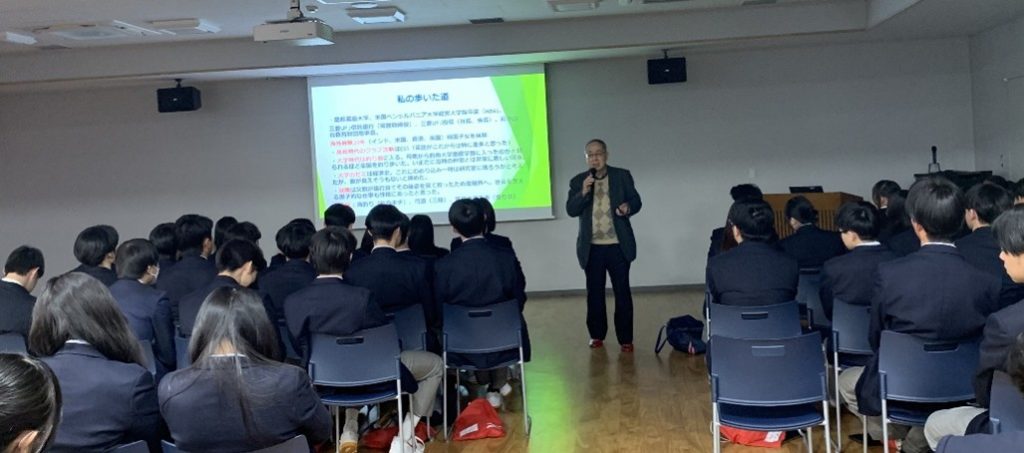 2月19日、日本大学明誠高校の多目的ホールで、3年生約330名を前に、DF会員2名が講演をおこないました。本講演は、卒業を控えた生徒に将来どのような世界、社会、仕事が待っているかを話して欲しい、との学校からのご依頼で、毎年開催しています。